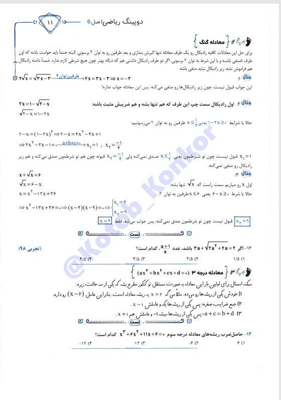 📖بخشی از کتاب ریاضی تجربی: کتاب به صورت جامع، تمام مباحث ریاضی پایه های دهم، یازدهم و دوازدهم را پوشش می دهد و با ارائهٔ تست های طبقه بندی شده، تمرین های هدفمند و پاسخ نامهٔ کاملاً تشریحی، دانش آموز را برای مواجهه با سوالات کنکور آماده می سازد. یکی از ویژگی های منحصربه فرد این کتاب، استفاده از QR Code در صفحات مختلف است که امکان دسترسی به ویدئوهای آموزشی و تدریس تصویری استاد سادات را فراهم می کند و تجربه ای ترکیبی از آموزش مکتوب و تصویری را در اختیار مخاطب قرار می دهد.