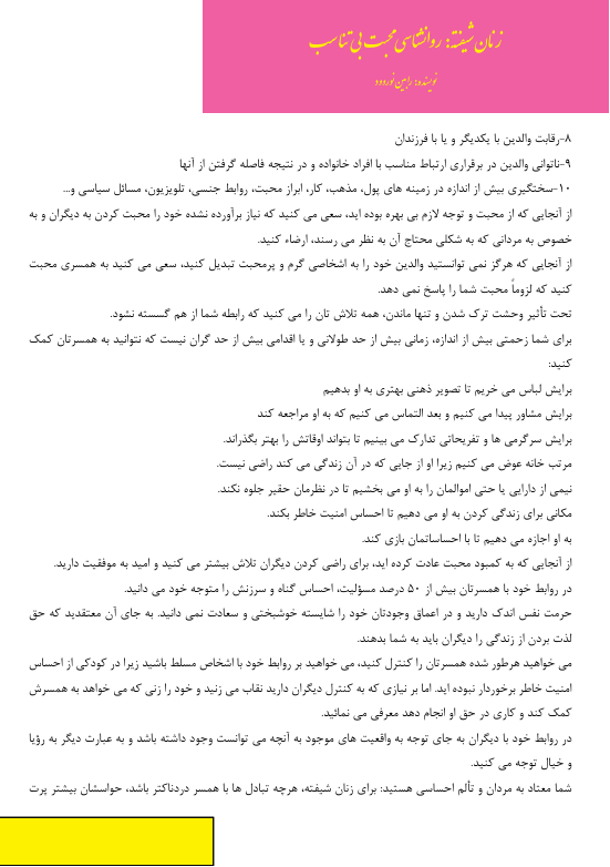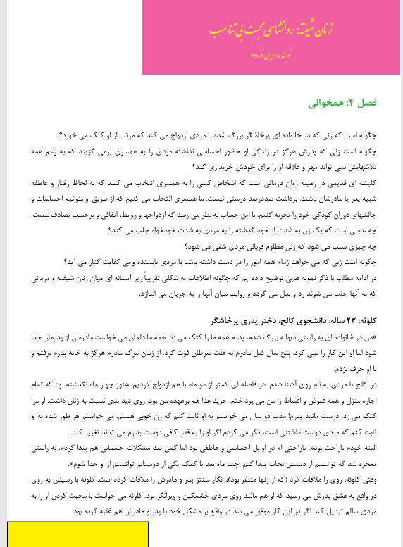 📖بخشی از کتاب زنان شیفته: نوروود با بهره گیری از تجربیات بالینی خود، نشان می دهد که بسیاری از زنان، به ویژه آن هایی که در خانواده هایی با زمینه های ناسالم (مانند اعتیاد، خشونت، یا بی توجهی عاطفی) رشد کرده اند، در بزرگسالی به دنبال جبران آن خلأها از طریق روابط عاشقانه می گردند. آن ها اغلب جذب مردانی می شوند که از نظر عاطفی سرد، کنترل گر، یا آسیب دیده اند، و با امید به تغییر دادن آن ها، خود را در چرخه ای از رنج، وابستگی و بی ارزشی گرفتار می کنند. کتاب «زنان شیفته» نه تنها به تحلیل روان شناختی این الگوها می پردازد، بلکه راهکارهایی برای رهایی از آن ها ارائه می دهد.