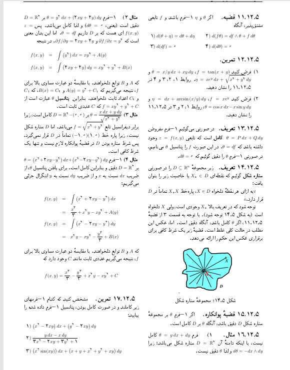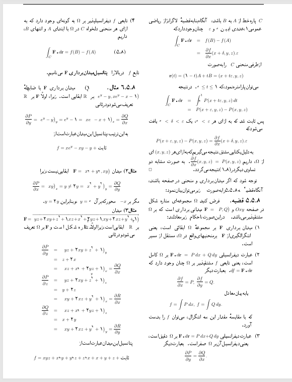 📖بخشی از کتاب ریاضی عمومی 2: این اثر در ۹ فصل تدوین شده و مباحثی چون جبر خطی، هندسه تحلیلی، توابع برداری، توابع چندمتغیره، مشتق و کاربردهای آن، انتگرال های دوگانه و سه گانه، انتگرال خطی، قضیه گرین، انتگرال سطحی و قضایای استوکس و گاوس را پوشش می دهد. نویسنده تلاش کرده با ارائهٔ مثال های متنوع و تمرین های هدفمند، درک مفاهیم را برای دانشجویان آسان تر کند و آن ها را برای حل مسائل پیچیده تر آماده سازد.