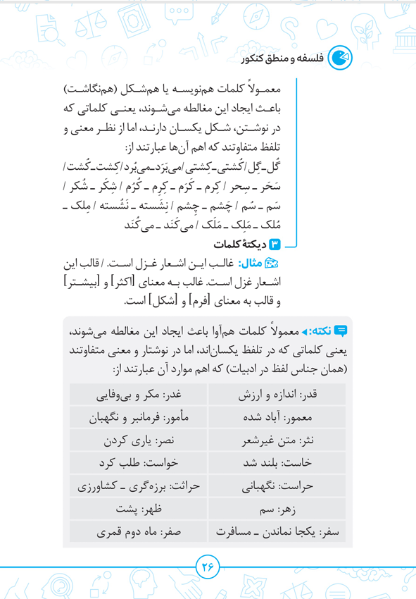 📖بخشی از کتاب فلسفه و منطق کنکور رشته انسانی: نویسندگان این اثر، با بهره گیری از تجربه تدریس و تحلیل کنکورهای سال های گذشته، مطالب را به صورت درس نامه های روان، نموداری و طبقه بندی شده ارائه کرده اند. در کنار آموزش مفهومی، تست های تألیفی و سراسری با پاسخ های کاملاً تشریحی قرار گرفته اند تا دانش آموز بتواند هم مهارت تست زنی خود را تقویت کند و هم نکات کلیدی هر مبحث را مرور کند.