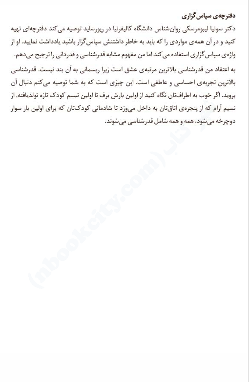 📖بخشی از کتاب آنچه زنان شادمان می‌دانند: نویسندگان معتقدند که شادی واقعی نه از موفقیت های بیرونی، بلکه از درون انسان سرچشمه می گیرد. آن ها با بررسی عواملی مانند ترس، احساس گناه، خشم، مقایسه گری، و وابستگی های ناسالم، نشان می دهند که چگونه می توان با تغییر نگرش، تمرین شکرگزاری، پذیرش خود، و ایجاد ارتباط های سالم، به آرامش و رضایت درونی رسید. کتاب همچنین به نقش معنویت، هدف مندی، و عشق ورزی در ساختن زندگی شاد اشاره دارد.